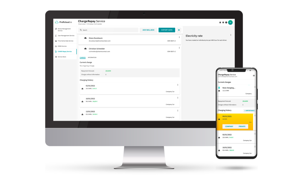 Phoenix Contact E-Mobility Produkte: Der Charge Repay Service auf einem Desktop-PC und einem Smartphone